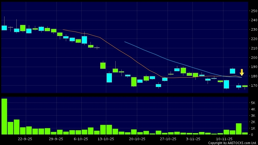 HESAI-W(02525.HK)'s SMA 10 crosses below SMA 20, which is a death cross. Last printed at 168.800; fell 0.706%; on volume of 333.52K shares and turnover of $56.08MRecent Performance...