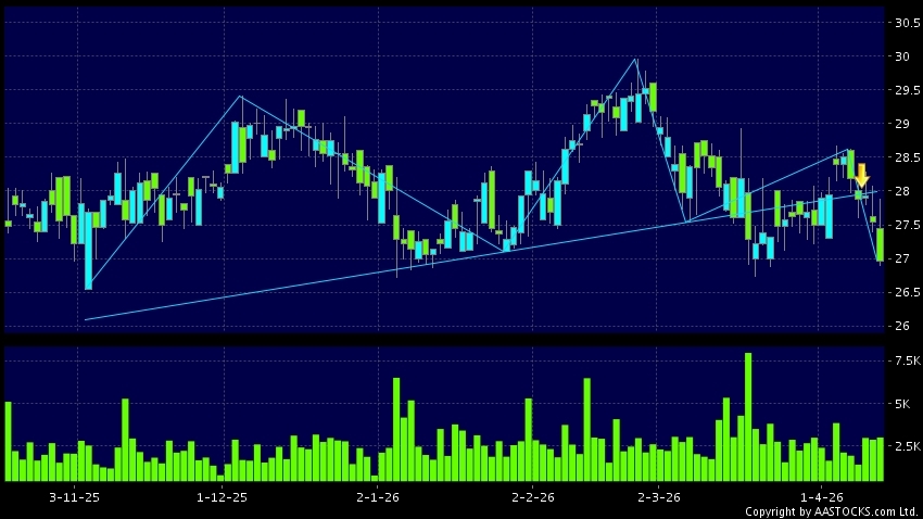 HENGAN INT'L(01044.HK) appears a downside breakout, dropped below the neckline. Last printed at 27.020; fell 1.888%; on volume of 3.24M shares and turnover of $87.61MRecent Perform...