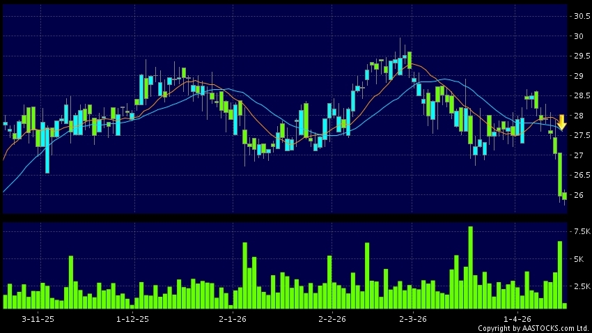 Disclaimer:The information, financial market data, quotes, charts, statistics and / or various technical analysis indicators are automatically generated based on the analyses and interpretations of publicly available information and should be used as references only at your own discretion. Such automatically generated content does not reflect the views or opinions of AASTOCKS.com Limited nor does AASTOCKS.com Limited make any guarantees to their accuracy, completeness, timeliness or correctness. You are advised to consult independent professional advice to verify pricing information or to obtain more detailed market information. Any uses of information or trades executed following the said automatically generated content are taken at your own risk for your own account.