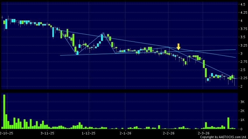 三角形向下突破是指股价的波幅渐渐收窄,在图表上形成三角形般的状态。股价在三角形的末端向下突破,下跌趋势形成,技术走势偏软。(港股报价延迟最少十五分钟。)