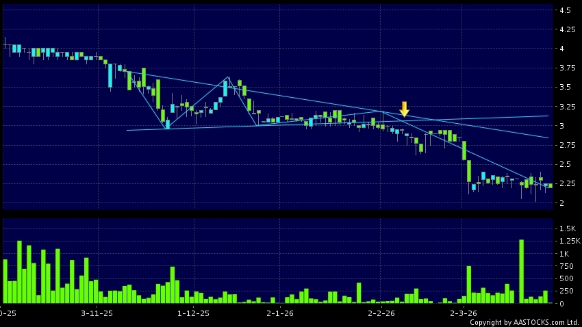 首佳科技(00103.HK) -0.090 (-3.965%) 呈现三角形向下突破。现价报2.200,下跌2.222%,成交量1.54万股,成交额3.40万。