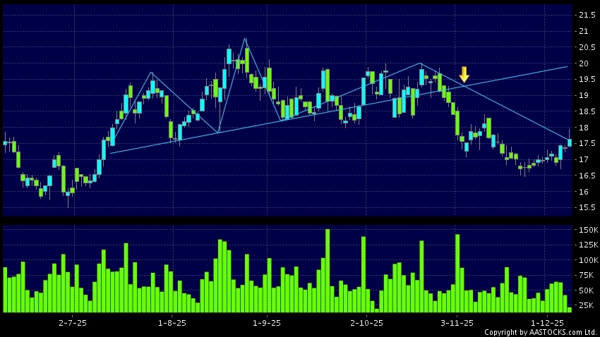 头肩顶是典型的沽出讯号,当股价跌穿支持线(颈线)时,跌势确认股价将持续下跌,技术走势偏软。(港股报价延迟最少十五分钟。沽空资料截至 2025-12-08 16:25。)