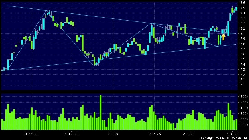 三角形向上突破是指股价的波幅渐渐收窄,在图表上形成三角形般的状态。股价在三角形的末端向上突破,形成上升趋势,技术走势向好。(港股报价延迟最少十五分钟。沽空资料截至 2026-04-16 16:25。)