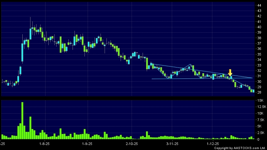 三角形向下突破是指股价的波幅渐渐收窄,在图表上形成三角形般的状态。股价在三角形的末端向下突破,下跌趋势形成,技术走势偏软。(港股报价延迟最少十五分钟。沽空资料截至 2025-12-31 12:25。)