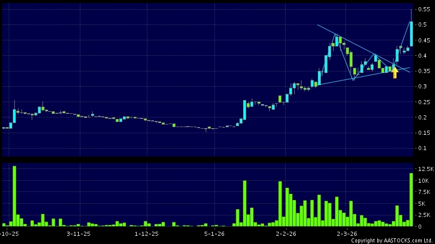 RIMBACO(01953.HK) +0.095 (+22.353%) 呈现三角形向上突破。现价报0.510,上升20.000%,成交量1.16千万股,成交额5.81百万。