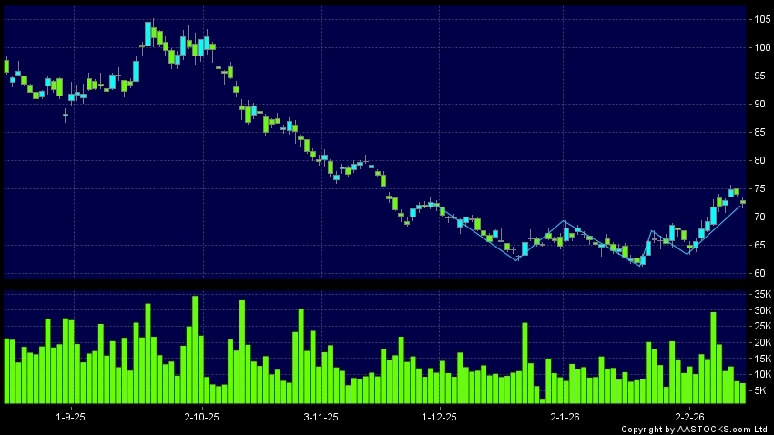 三重底指股票下跌至三个相近的低点後,持续反弹,然後形成上升趋势,属利好讯号。三个低点便成为一个稳固的支持位。(港股报价延迟最少十五分钟。沽空资料截至 2026-02-13 12:25。)