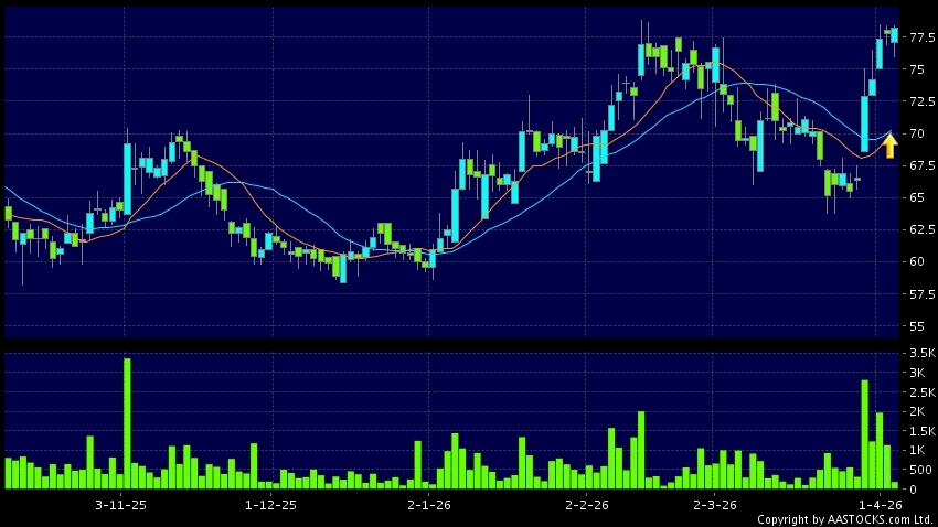 黄金交叉是一个利好讯号,指股价的短期移动平均线升穿长期移动平均线,例如50天线升穿250天线,在图表上构成交叉的形状。股价通常会上升形成一个上升趋势,技术走势向好。(港股报价延迟最少十五分钟。沽空资料截至 2026-04-17 12:25。)
