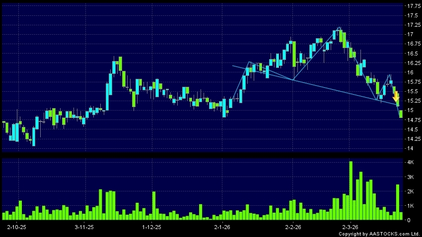頭肩頂是典型的沽出訊號,當股價跌穿支持線(頸線)時,跌勢確認股價將持續下跌,技術走勢偏軟。(港股報價延遲最少十五分鐘。沽空資料截至 2026-04-17 16:25。)