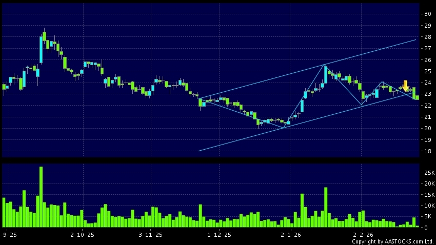 區域突破指股價在過去的一段時間只在一個範圍在內活動,然後股價下跌作出突破,跌穿區域的底部,技術走勢偏軟。(港股報價延遲最少十五分鐘。沽空資料截至 2026-03-06 12:25。)