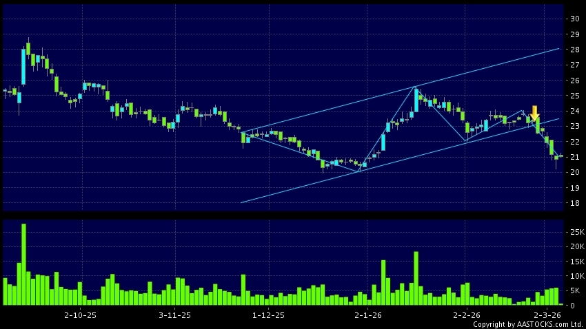 區域突破指股價在過去的一段時間只在一個範圍在內活動,然後股價下跌作出突破,跌穿區域的底部,技術走勢偏軟。(港股報價延遲最少十五分鐘。沽空資料截至 2026-03-06 12:25。)