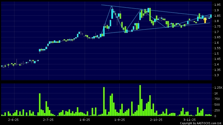 震雄集團(00057.HK) -0.020 (-1.205%) 呈現三角形向上突破。現價報1.860,上升1.639%,成交量5.40萬股,成交額9.89萬。