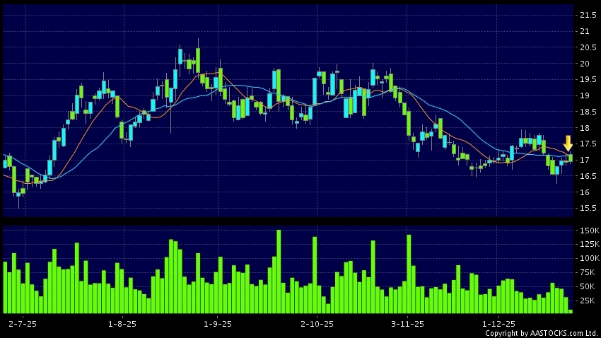 吉利汽車(00175.HK) -0.040 (-0.236%) 沽空 $7.42千萬; 比率 35.833% 10天移動平均線跌穿20天移動平均線,出現死亡交叉。現價報16.940,上升0.059%,成交量9.08百萬股,成交額1.55億。
