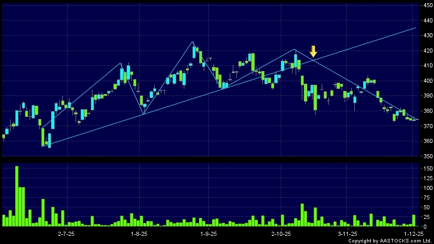 香港交易所-R(80388.HK) -1.400 (-0.374%) 沽空 $1.98百萬; 比率 31.373% 呈現頭肩頂向下突破。現價報373.800,下跌0.053%,成交量1.60千股,成交額59.92萬。