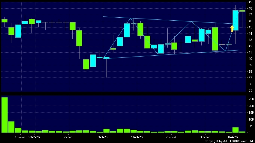 先導智能(00470.HK) -0.360 (-0.726%) 呈現三角形向上突破。現價報47.500,下跌0.419%,成交量96.68萬股,成交額4.59千萬。