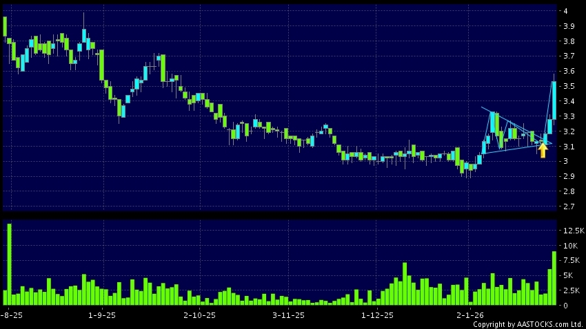 三角形向上突破是指股價的波幅漸漸收窄,在圖表上形成三角形般的狀態。股價在三角形的末端向上突破,形成上升趨勢,技術走勢向好。(港股報價延遲最少十五分鐘。沽空資料截至 2026-01-30 16:25。)
