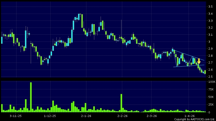 三角形向下突破是指股價的波幅漸漸收窄,在圖表上形成三角形般的狀態。股價在三角形的末端向下突破,下跌趨勢形成,技術走勢偏軟。(港股報價延遲最少十五分鐘。沽空資料截至 2026-04-22 16:25。)