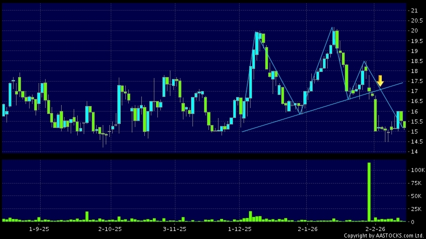 頭肩頂是典型的沽出訊號,當股價跌穿支持線(頸線)時,跌勢確認股價將持續下跌,技術走勢偏軟。(港股報價延遲最少十五分鐘。沽空資料截至 2026-02-13 16:25。)