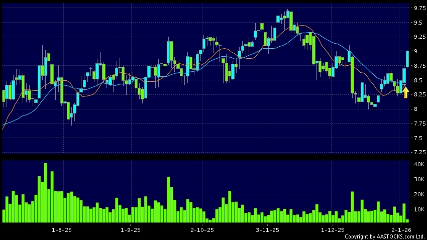 信義玻璃(00868.HK) +0.030 (+0.358%) 沽空 $5.05百萬; 比率 17.740% 10天移動平均線升穿20天移動平均線,出現黃金交叉。現價報8.920,上升2.529%,成交量3.53百萬股,成交額3.14千萬。