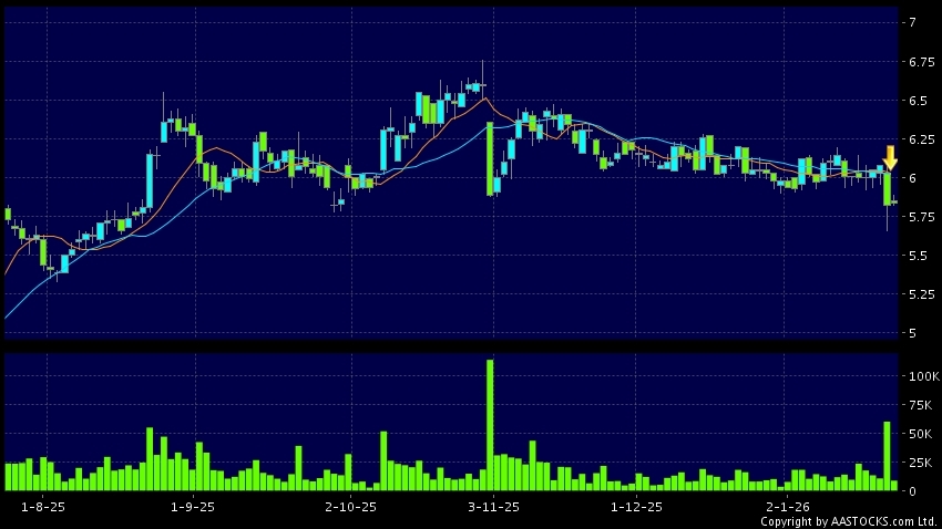 死亡交叉是一個利淡信號,指股價的短期移動平均線跌穿長期移動平均線,例如50天線跌穿250天線,在圖表上構成交叉的形狀。股價通常會下跌形成一個下降趨勢,技術走勢偏軟。(港股報價延遲最少十五分鐘。沽空資料截至 2026-02-06 16:25。)