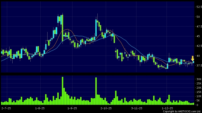瑞聲科技(02018.HK) +0.680 (+1.793%) 沽空 $6.81百萬; 比率 7.093% 10天移動平均線跌穿20天移動平均線,出現死亡交叉。現價報38.600,上升1.793%,成交量2.48百萬股,成交額9.60千萬。