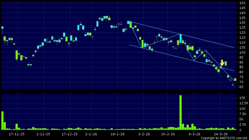 區域突破指股價在過去的一段時間只在一個範圍在內活動,然後股價下跌作出突破,跌穿區域的底部,技術走勢偏軟。(港股報價延遲最少十五分鐘。沽空資料截至 2026-04-01 12:25。)