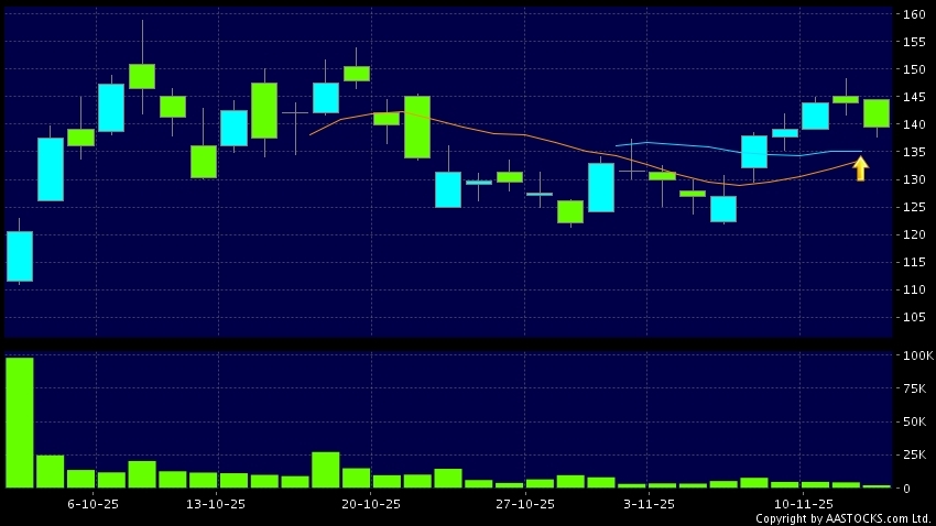 紫金黃金國際(02259.HK) -3.600 (-2.503%) 10天移動平均線升穿20天移動平均線,出現黃金交叉。現價報139.300,下跌3.129%,成交量2.15百萬股,成交額3.03億。