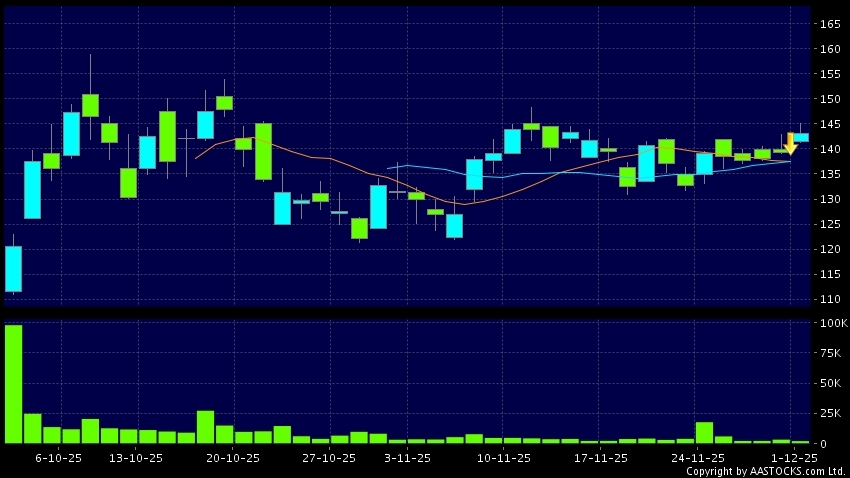 紫金黃金國際(02259.HK) +2.900 (+2.006%) 沽空 $6.79千萬; 比率 12.424% 10天移動平均線跌穿20天移動平均線,出現死亡交叉。現價報143.300,上升2.945%,成交量2.05百萬股,成交額2.96億。
