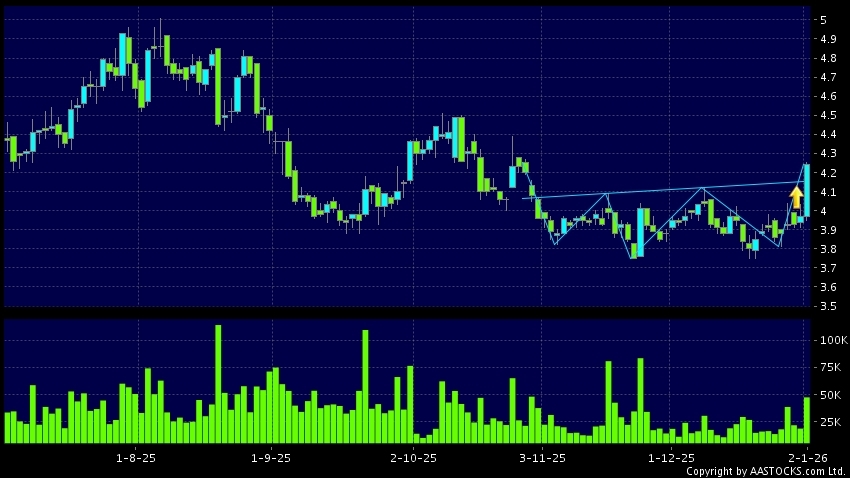 中航科工(02357.HK) +0.270 (+6.801%) 沽空 $1.80千萬; 比率 9.103% 呈現頭肩底向上突破,股價升穿頸線。現價報4.240,上升6.801%,成交量4.73千萬股,成交額1.98億。