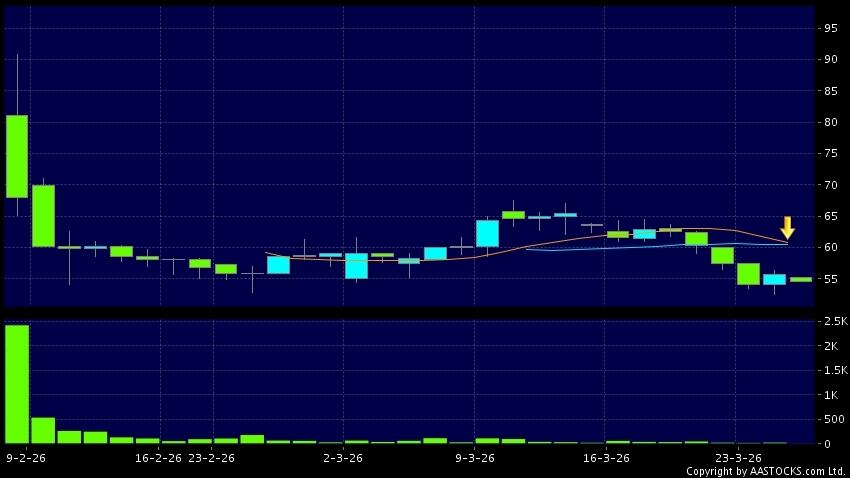 卓正醫療(02677.HK) -2.450 (-4.399%) 10天移動平均線跌穿20天移動平均線,出現死亡交叉。現價報54.550,下跌2.065%,成交量450.00股,成交額2.47萬。