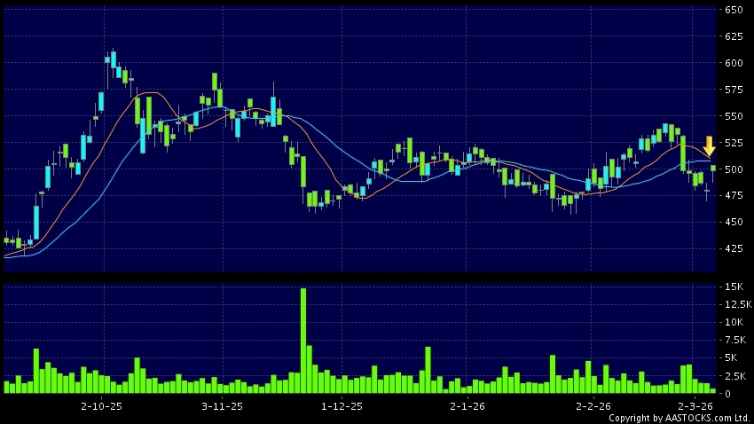 寧德時代(03750.HK) +20.600 (+4.299%) 沽空 $4.66億; 比率 38.029% 10天移動平均線跌穿20天移動平均線,出現死亡交叉。現價報500.000,上升4.341%,成交量70.07萬股,成交額3.49億。