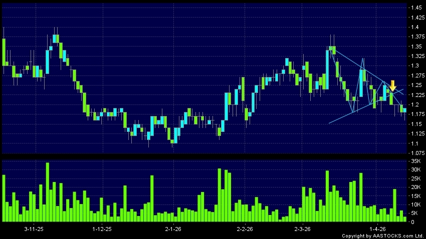 三角形向下突破是指股價的波幅漸漸收窄,在圖表上形成三角形般的狀態。股價在三角形的末端向下突破,下跌趨勢形成,技術走勢偏軟。(港股報價延遲最少十五分鐘。沽空資料截至 2026-04-28 16:25。)