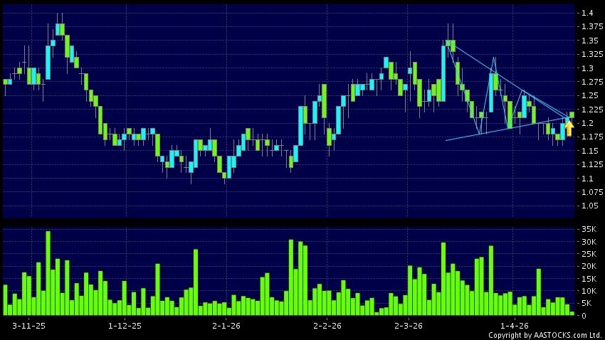 三角形向上突破是指股價的波幅漸漸收窄,在圖表上形成三角形般的狀態。股價在三角形的末端向上突破,形成上升趨勢,技術走勢向好。(港股報價延遲最少十五分鐘。沽空資料截至 2026-04-24 16:25。)