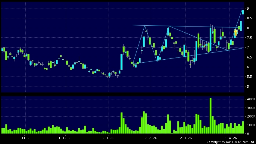 三角形向上突破是指股價的波幅漸漸收窄,在圖表上形成三角形般的狀態。股價在三角形的末端向上突破,形成上升趨勢,技術走勢向好。(港股報價延遲最少十五分鐘。沽空資料截至 2026-04-16 16:25。)