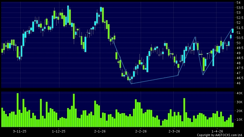 招商銀行(03968.HK) -0.750 (-1.462%) 沽空 $4.78億; 比率 47.358% 呈現杯柄形向上突破。現價報51.400,上升1.181%,成交量6.61百萬股,成交額3.39億。