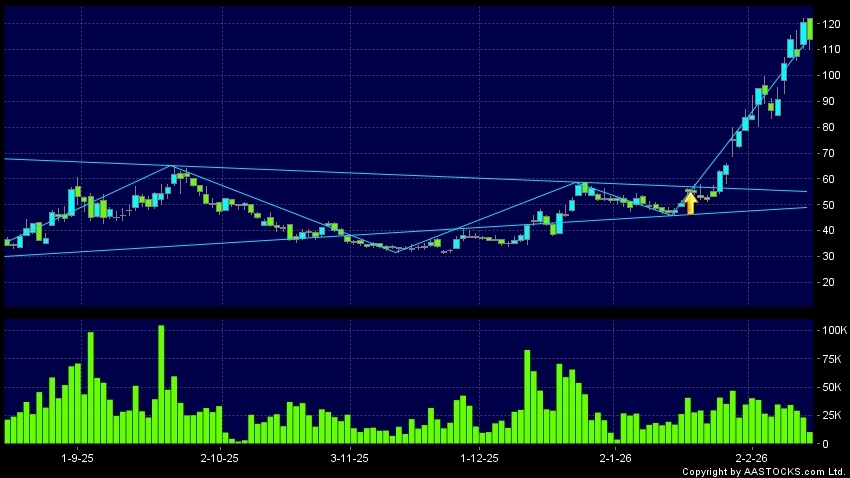 三角形向上突破是指股價的波幅漸漸收窄,在圖表上形成三角形般的狀態。股價在三角形的末端向上突破,形成上升趨勢,技術走勢向好。(港股報價延遲最少十五分鐘。沽空資料截至 2026-02-13 12:25。)