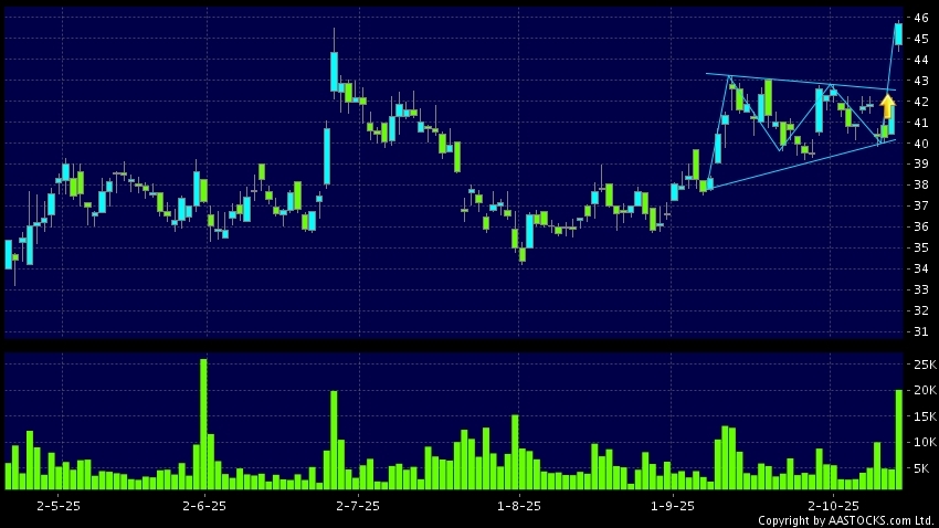 三角形向上突破是指股價的波幅漸漸收窄,在圖表上形成三角形般的狀態。股價在三角形的末端向上突破,形成上升趨勢,技術走勢向好。(港股報價延遲最少十五分鐘。沽空資料截至 2025-10-21 16:25。)