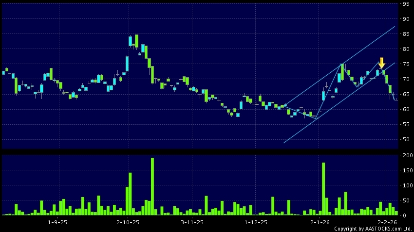 區域突破指股價在過去的一段時間只在一個範圍在內活動,然後股價下跌作出突破,跌穿區域的底部,技術走勢偏軟。(港股報價延遲最少十五分鐘。沽空資料截至 2026-02-05 16:25。)