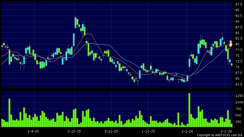 死亡交叉是一個利淡信號,指股價的短期移動平均線跌穿長期移動平均線,例如50天線跌穿250天線,在圖表上構成交叉的形狀。股價通常會下跌形成一個下降趨勢,技術走勢偏軟。(港股報價延遲最少十五分鐘。沽空資料截至 2026-02-05 16:25。)
