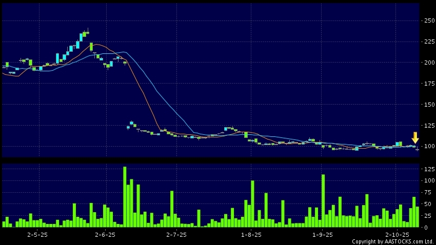 比亞迪股-R一百(81211.HK) -1.600 (-1.616%) 沽空 $3.59百萬; 比率 80.590% 10天移動平均線跌穿20天移動平均線,出現死亡交叉。現價報95.750,下跌3.283%,成交量4.45萬股,成交額4.26百萬。