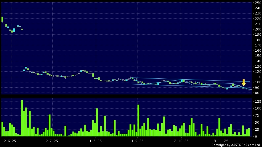 區域突破指股價在過去的一段時間只在一個範圍在內活動,然後股價下跌作出突破,跌穿區域的底部,技術走勢偏軟。(港股報價延遲最少十五分鐘。沽空資料截至 2025-11-24 16:25。)